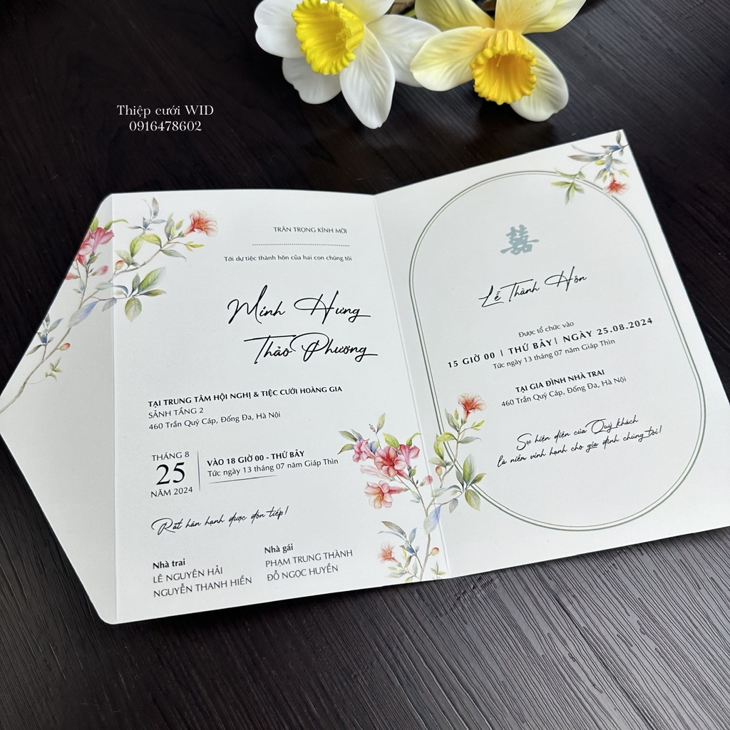 - Sản phẩm thiệp cưới phong cách hoa cỏ dại đan xen là lựa chọn lãng mạn và độc đáo cho đám cưới của bạn, mang đến sự gần gũi với thiên nhiên và sự tự do của tình yêu.