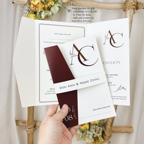 - Thiệp gập 3 cạnh cơ bản, kèm đai giấy