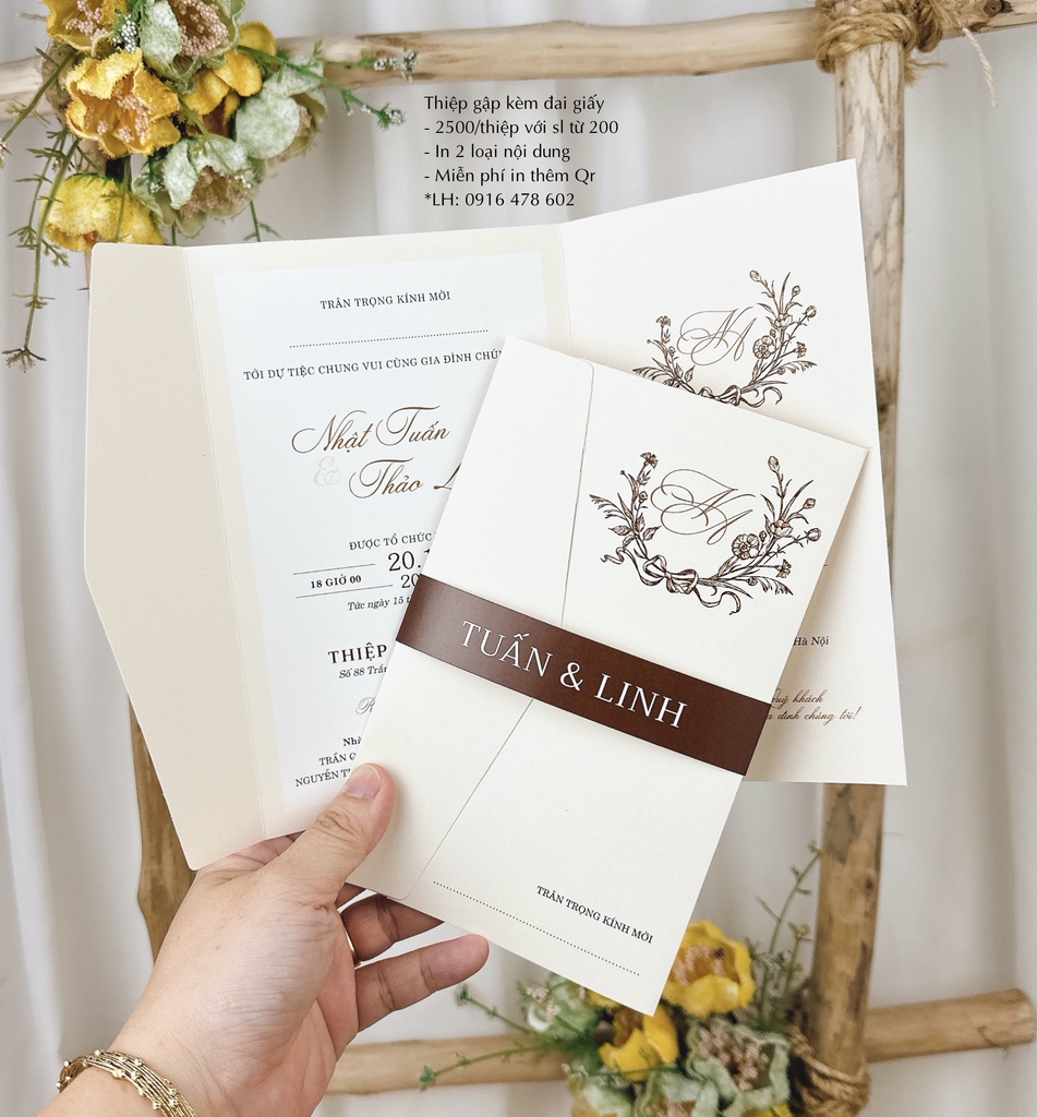 - Thiệp gập 3 cạnh cơ bản, kèm đai giấy
