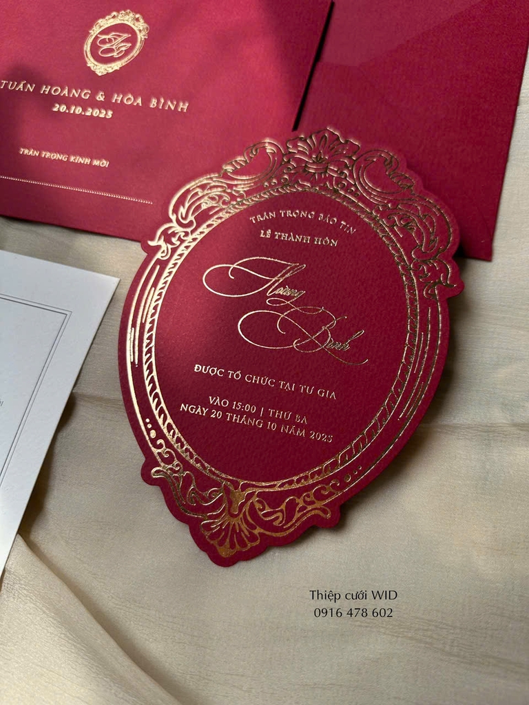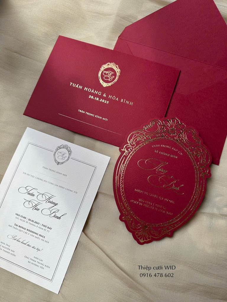 Bộ thiệp gồm 1 phong bì + 2 tờ rời (ép nhũ 2 chi tiết bìa phong bì và tờ thiệp đỏ)