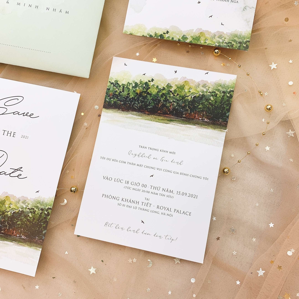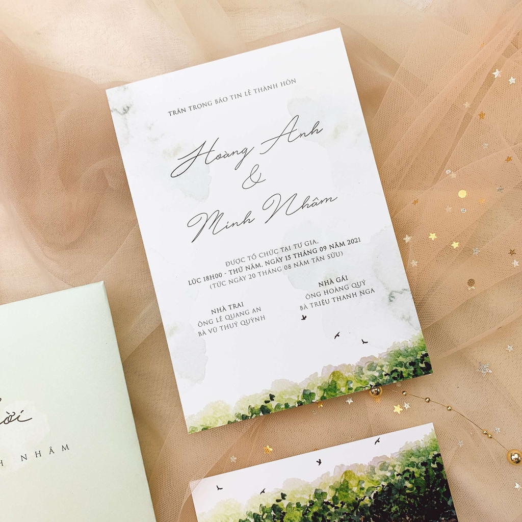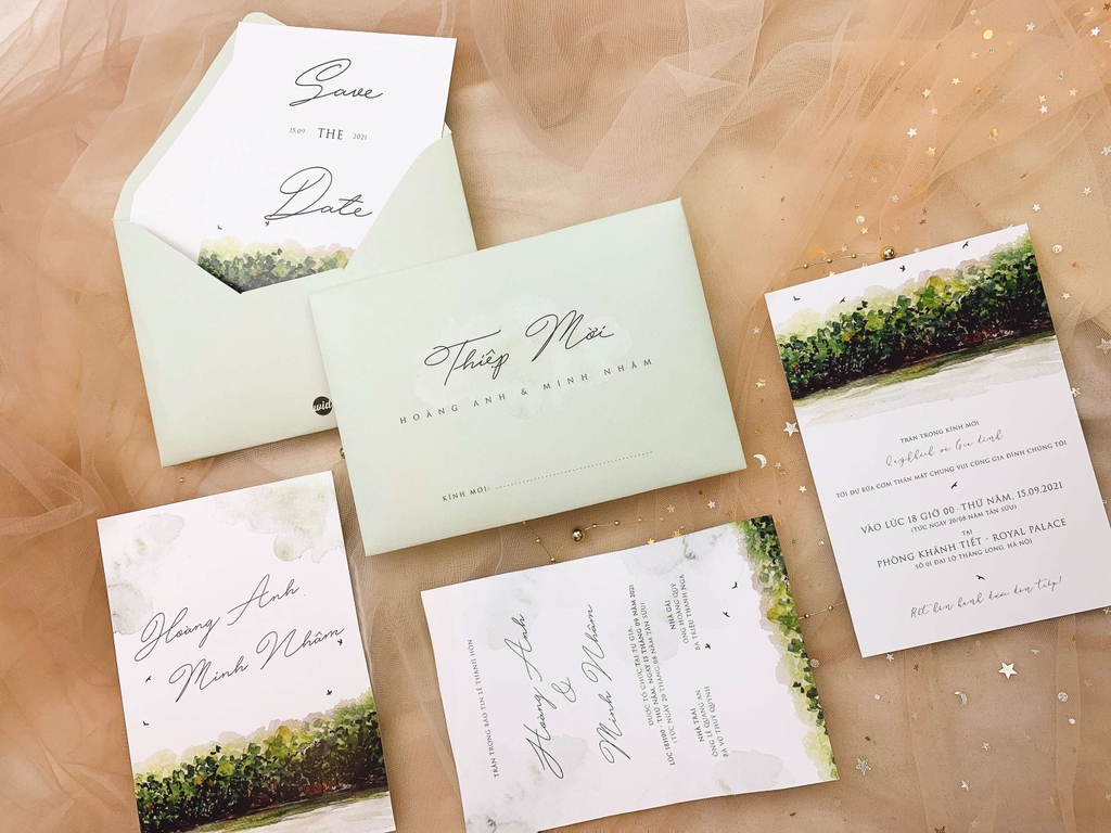 - Những mẫu thiệp tông xanh lá không chỉ làm nổi bật vẻ tươi mới của mùa hè mà còn mang lại cảm giác dịu mát cho buổi lễ đám cưới.