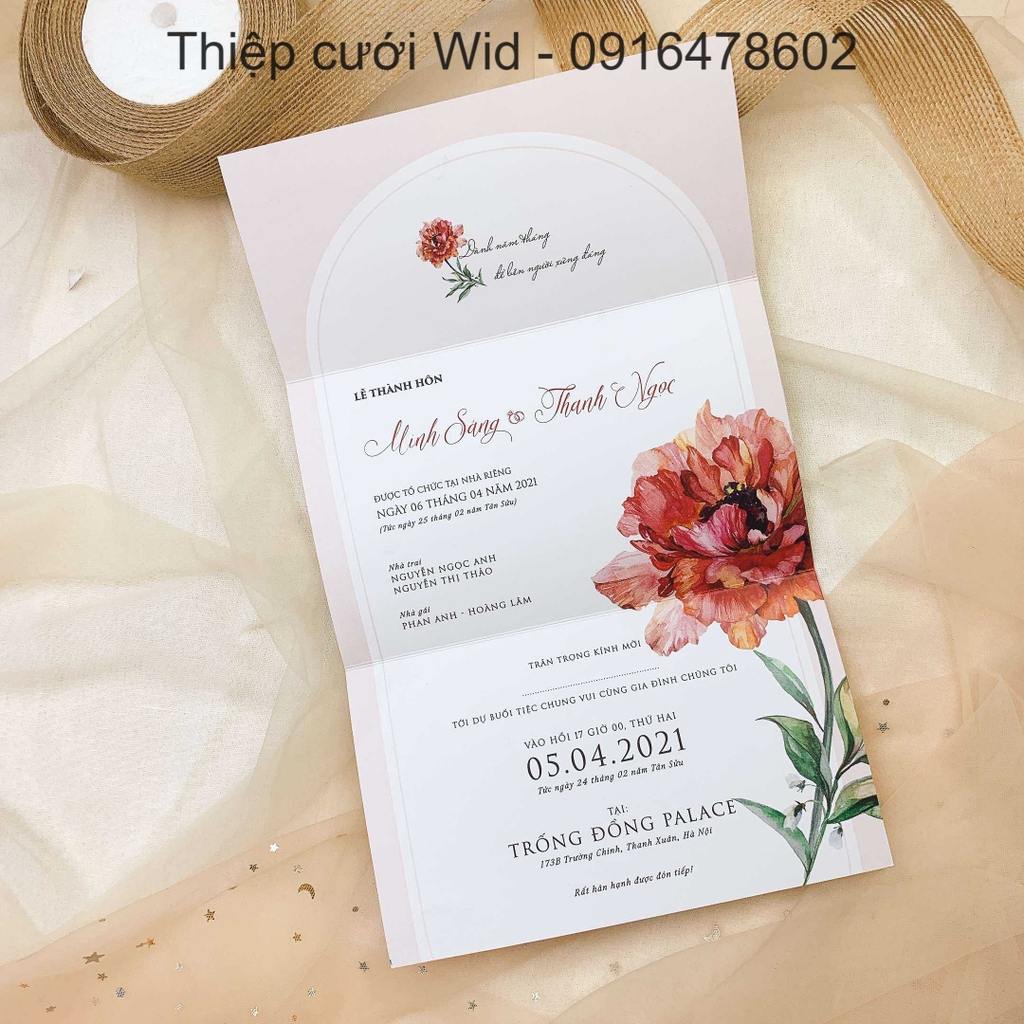 - Thiệp cưới Hoa Mẫu Đơn là biểu tượng của sự tinh tế, mang trong mình ý nghĩa về sự thuần khiết và sự tươi mới trong tình yêu hôn nhân.