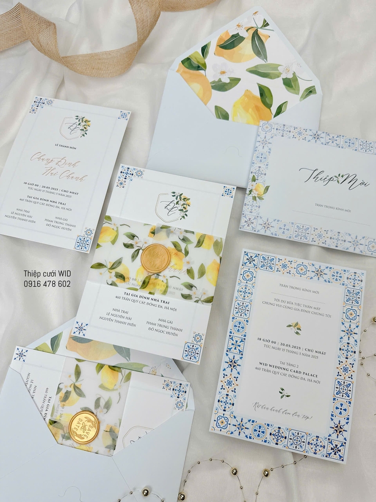 Thiệp gồm 1 phong bì kèm 2 tờ thiệp đơn - kèm phụ kiện đai giấy can trong, dấu seal nhựa sẵn