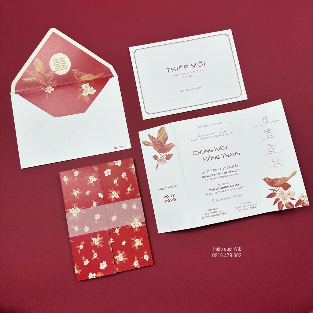 Thiệp gồm 1 phong bì kèm 1 tờ thiệp gập 3 cạnh - kèm phụ kiện đai giấy can trong
