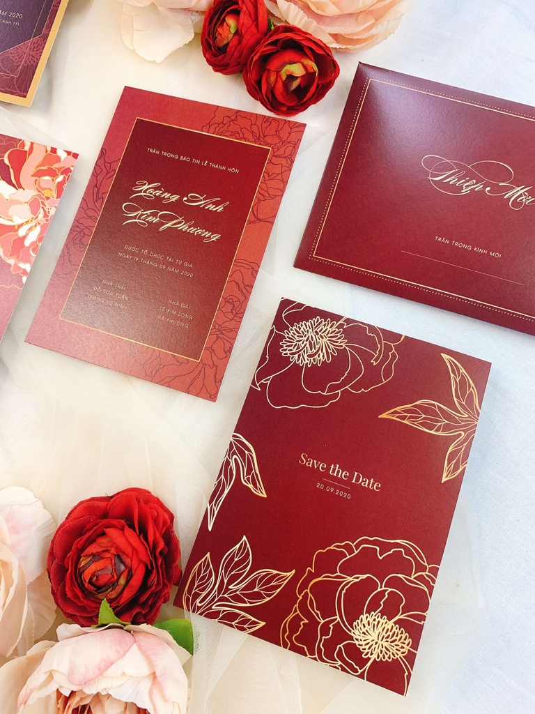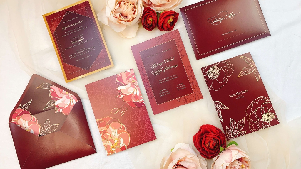 Thiệp gồm 1 phong bì kèm 2 tờ thiệp đơn hoặc 1 thiệp gập đôi