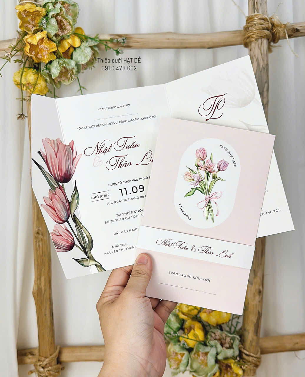 Một điểm cộng lớn: thiệp pastel lên hình rất đẹp – từ ảnh chụp sản phẩm đến hình phóng to cho phông nền cưới, ảnh cầm thiệp đều trông rất hài hòa và sang.