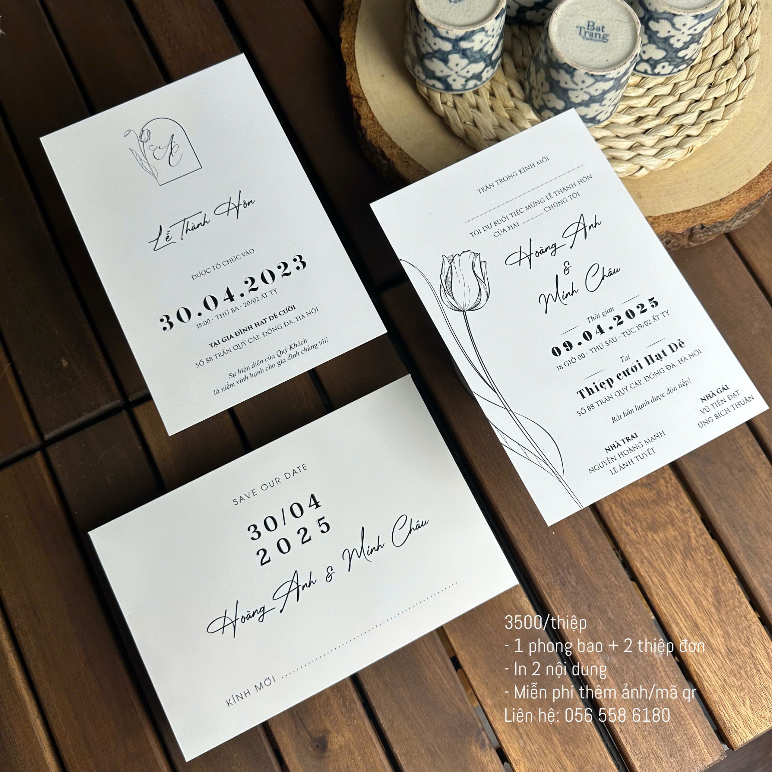 Gam trắng thể hiện sự tinh khiết, nhẹ nhàng và thanh lịch. Thiệp cưới màu trắng phù hợp với phong cách hiện đại, tối giản hoặc các cặp đôi yêu thích sự trang nhã, cổ điển phương Tây.